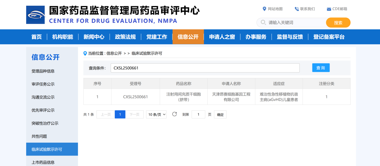 2025年11月3日, 天津昂賽細(xì)胞基因工程有限公司申報(bào)的注射用間充質(zhì)干細(xì)胞(臍帶)治療難治性急性移植物抗宿主?。╝GvHD)兒童患者的適應(yīng)癥獲得國(guó)家藥品監(jiān)督管理局臨床試驗(yàn)?zāi)驹S可