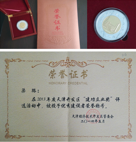 ? ? ? ? 2014年5月9日,天津開發(fā)區(qū)2013年度“百強(qiáng)企業(yè)”、“成長最快企業(yè)”、“科技創(chuàng)新單位”、“科技小巨人”、“社會(huì)責(zé)任貢獻(xiàn)獎(jiǎng)”、“建功立業(yè)獎(jiǎng)”等獎(jiǎng)項(xiàng)頒獎(jiǎng)大會(huì)在投資服務(wù)中心舉行。會(huì)上,我公司技術(shù)開發(fā)部副經(jīng)理梁璐博士被授予優(yōu)秀建設(shè)者榮譽(yù)稱號(hào)。