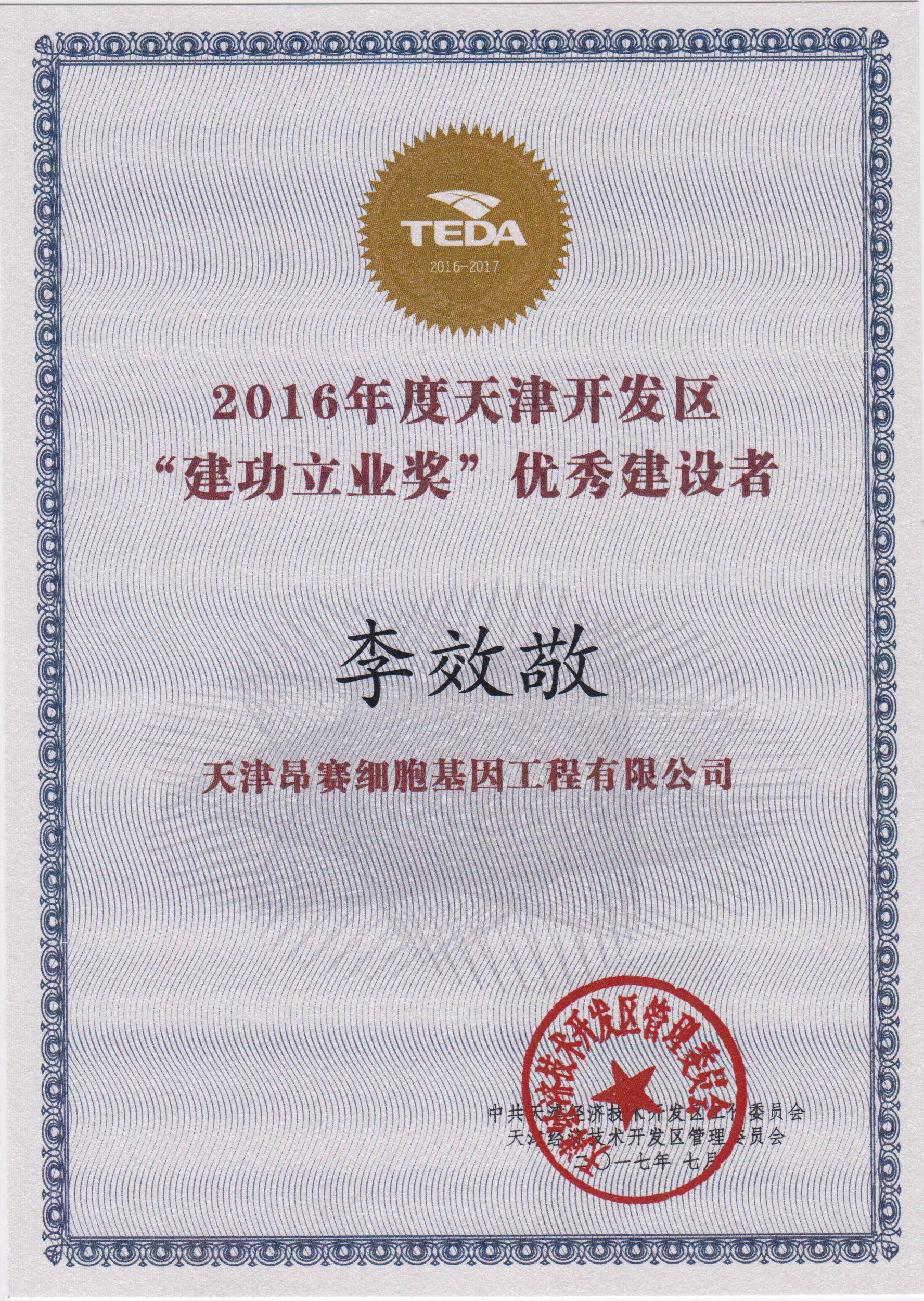 ? ? 2017年9月20日,我公司李效敬同志榮獲天津經(jīng)濟(jì)技術(shù)開(kāi)發(fā)區(qū)頒發(fā)的2016年度“建功立業(yè)獎(jiǎng)”。