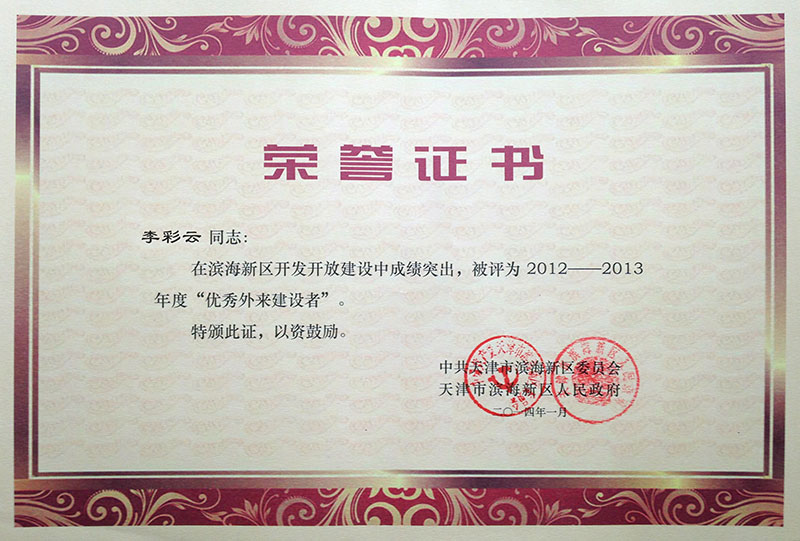李效敬、李彩云兩位同事因在濱海新區(qū)開發(fā)開放建設(shè)中成績突出 被濱海新區(qū)區(qū)委、區(qū)政府評為2012-2013年度“優(yōu)秀外來建設(shè)者”
